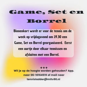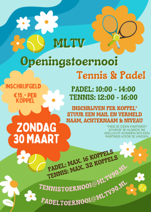 Na het succes van de padelladder afgelopen winter starten we per 1 april 2019 met de MLTV'90 tennis clubladder. Een leuke manier om regelmatig wedstrijden te spelen tegen (gemengd) dubbels van jouw eigen niveau.