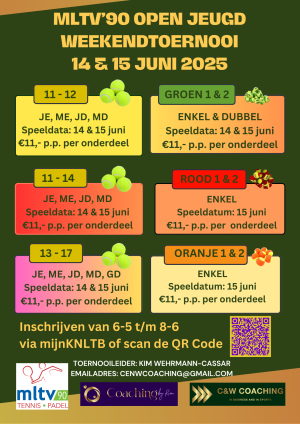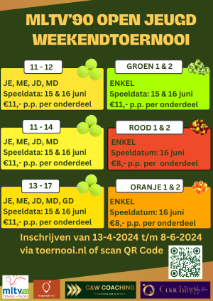 In het weekend van 14 en 15 juni organiseert MLTV’90 het Open Jeugd Weekendtoernooi voor alle jeugdspelers, van rood tot en met geel.