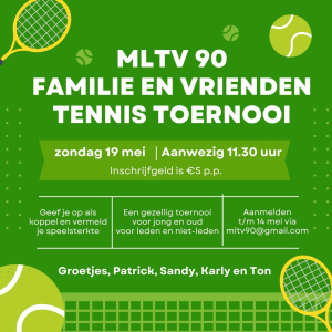 Op zondag 8 juni organiseert MLTV’90 weer het gezellige Familie Tennistoernooi!