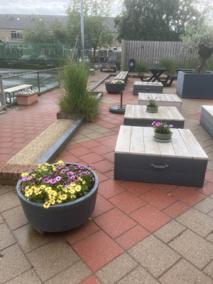 Afgelopen maandag 22 juli werd ons terras verfraaid met een nieuwe bank, statafel en een aantal lage tafels die ook als bank kunnen fungeren.