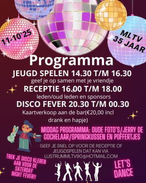 MLTV'90 bestaat 35 jaar en dat vieren we graag met jou! Zet zaterdag 11 oktober alvast in je agenda om ons jubileum feestelijk te vieren.