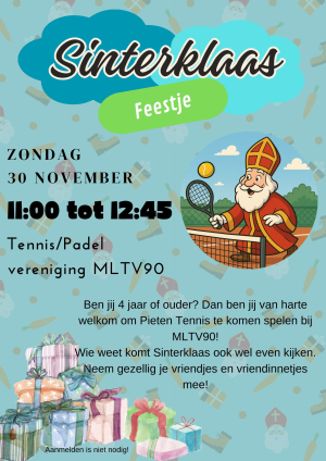 Op zondag 30 november organiseren we een gezellig Sinterklaasfeest met Pieten Tennis bij MLTV'90. Kinderen vanaf 4 jaar kunnen lekker meespelen, kijken en vooral heel veel plezier maken.