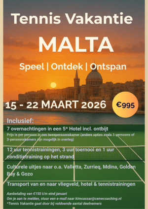 Van 15 tot en met 22 maart 2026 organiseert onze tennisschool C&W Academy een tennisvakantie naar Malta. Een week waarin we samen trainen om fit en scherp aan de start van de voorjaarscompetitie te verschijnen, maar waarin ook volop ruimte is voor ontspanning en gezelligheid. Of je nu al jaren tennist of nog niet zo lang speelt, iedereen is van harte welkom.