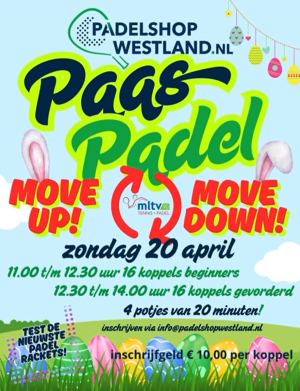 Op zondag 20 april (1e Paasdag) organiseert Padelshop Westland een superleuk Move Up Move Down padeltoernooi bij MLTV90!